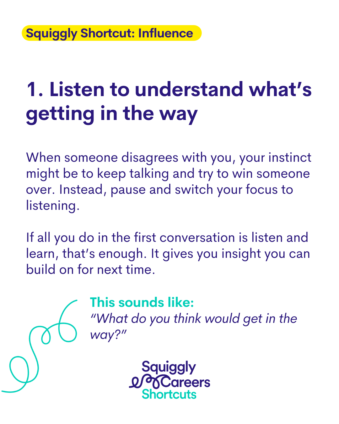 I think you are much better off being open to listening, because through that listening, that is how you then learn more about what's getting in the way, why somebody actually really disagrees. So if someone didn't like the idea of squiggly careers, let's imagine they said, I just don't think it will work in our company or in our culture. Rather than then trying to give them lots of reasons why it will work, I would now say, oh, that's really interesting. Like, what do you think would get in the way? What has worked really well? So just listen and learn. And if in that first conversation that's all you've done, that's okay. I think sometimes, you know, really kind of big influencing takes a while. You don't achieve it all in one conversation.