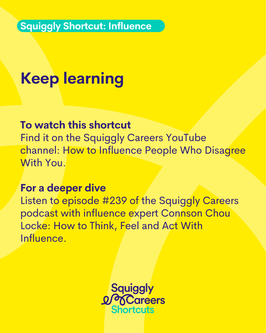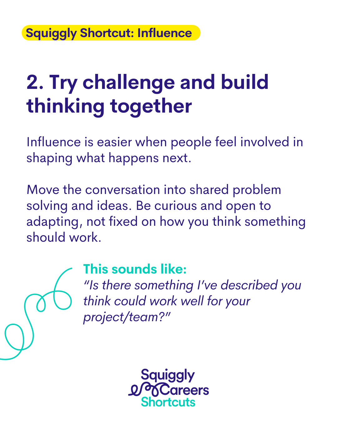 And then the third thing is just to make sure that there is a clear payoff that somebody cares about for whatever you're trying to influence on. And I don't think, as we said, it's probably not where you start, but it is a good place to finish. Now, it can't necessarily just be the payoff that you think is the right payoff. It has got to be a payoff that they care about. And if you've not done the first bit, if you've not been really open to listening and then you've not sort of done that challenge and build and involved them in that, it's very hard for you to do that last bit. Whereas actually, if you've done a really good job there, you can think about, well, for squiggly careers, what do I know is better because of squiggly careers, people take ownership for their careers. It feels much more personal, it feels more relevant. People can develop in different directions. They can transfer their talents. Which of the different things that I know squiggly careers are good for is going to matter most to this person. And so again, you're being sort of smart and reflecting their situation back to them and saying, well, if actually your challenge is ownership, like, one of the things that we know is that squiggly careers will really help with that. And so I hope that feels useful. I often feel like influence is one of those words that can feel a bit manipulative. So we might feel awkward about getting better at influence, but it does really matter because we all need to influence each other to kind of get work done and to have an impact, because you can so rarely deliver big bits of work by yourself. So you have got to go and influence lots of other people. But it's sort of the how you do that and the kind of the approach you take I think can make a really big difference. So I hope that felt helpful. If you want to listen to another episode of the Squiggly Careers podcast with an Ask the Expert with Constant Locke. She's a brilliant expert on Influence. It is episode 239 that's definitely worth diving into if you've got an extra 20 minutes or so.